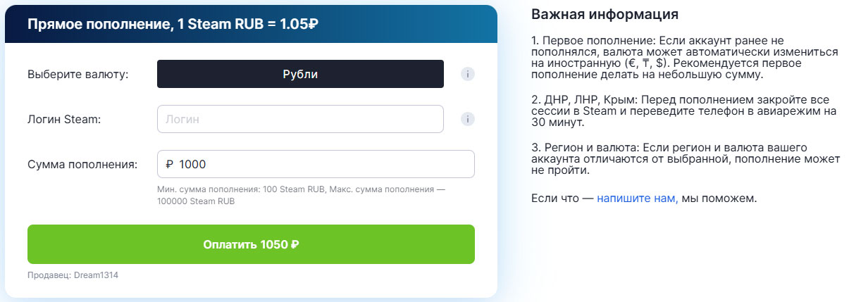 Заходим на страницу закрытой распродажи. Здесь нам будет предложено пополнить Steam с минимальной комиссией через случайного продавца. (обычно выбирается один из самых популярных и надёжных). Если вы хотите выбрать продавца самостоятельно, то вам сюда. У разных продавцов могут быть доступны разные способы оплаты, но СБП обычно есть везде. Обязательно читаем блок с «Важной информацией». Мы, кстати, пополняли казахстанский аккаунт — всё прошло успешно, валюта конвертировалась без проблем.