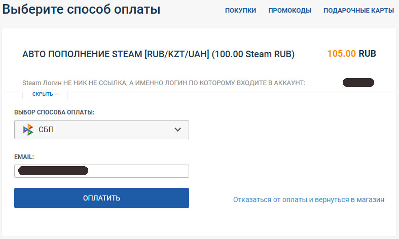 Регистрируемся на сайте. Переходим на страницу пополнения. Вводим логин Steam-аккаунта, который хотим пополнить. Внимание! Не путайте логин с именем пользователя! Логин — это то, что вы вводите при входе в аккаунт Steam. Выбираем способ пополнения «СБП» (иначе будет дороже на 2%).