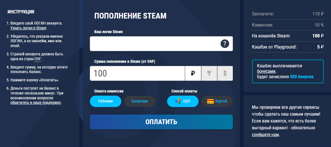 Существует множество специальных сервисов, через которые вы можете быстро пополнить баланс Steam. Комиссия в таких сервисах обычно составляет от 10 до 25%. Но есть приятное исключение — PlayGround.ru.