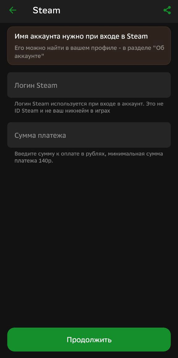 Вводим логин Steam-аккаунта. Внимание! Не путайте логин с именем пользователя! Логин — это то, что вы вводите при входе в аккаунт Steam. Вводим сумму. Готово.